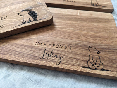 Entdecke unsere liebevoll gestalteten Frühstücksbretter aus robustem Eichenholz – geölt mit natürlichem Leinöl und verziert mit niedlichen Tiermotiven wie Fuchs, Hase, Bär, Igel, Eichhörnchen oder Hirsch. Jedes Brett ist ideal für Obst, Gemüse, Brot und kleine Snacks und kann auf Wunsch mit dem Namen deines Kindes personalisiert werden. Praktisch, sicher und mit einem persönlichen Touch – perfekt für jeden Frühstückstisch oder als besonderes Geschenk.